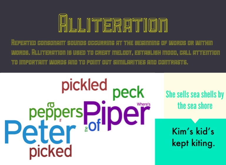 Repeated consonant sounds occurring at the beginning of words or within words. Alliteration is used to creat melody, establish mood, call attention to important words and to point out similarities and contrasts.