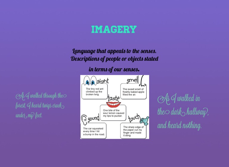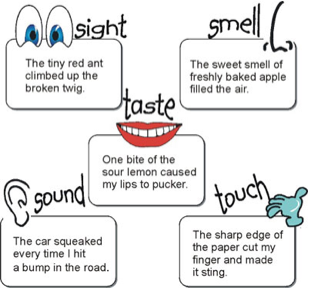 Language that appeals to the senses. Descriptions of people or objects stated in terms of our senses.