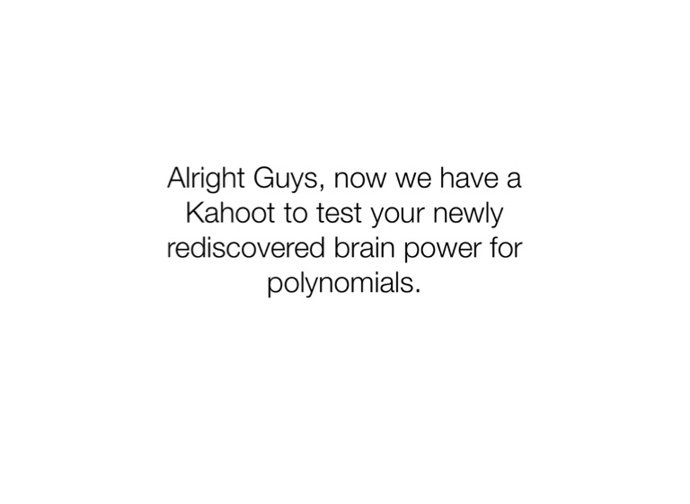 Alright Guys, now we have a Kahoot to test your newly rediscovered brain power for polynomials.