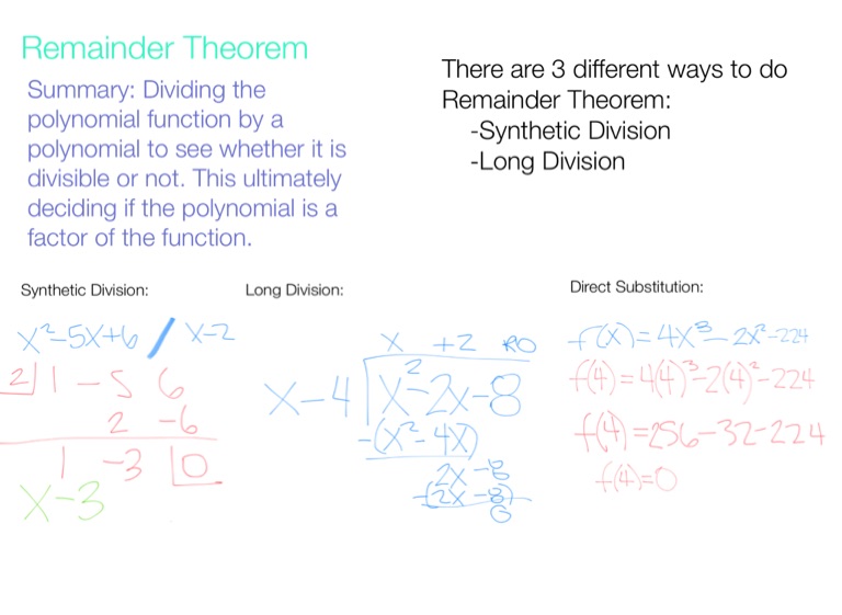 Summary: Dividing the polynomial function by a polynomial to see whether it is divisible or not. This ultimately deciding if the polynomial is a factor of the function.