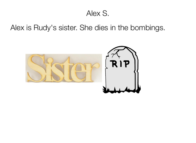 Alex is Rudy's sister. She dies in the bombings.