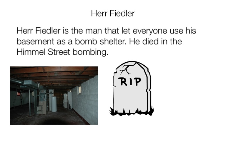 Herr Fiedler is the man that let everyone use his basement as a bomb shelter. He died in the Himmel Street bombing.