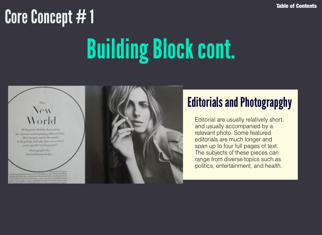 Editorial are usually relatively short, and usually accompanied by a relevant photo. Some featured editorials are much longer and span up to four full pages of text. The subjects of these pieces can range from diverse topics such as politics, entertainment, and health.
