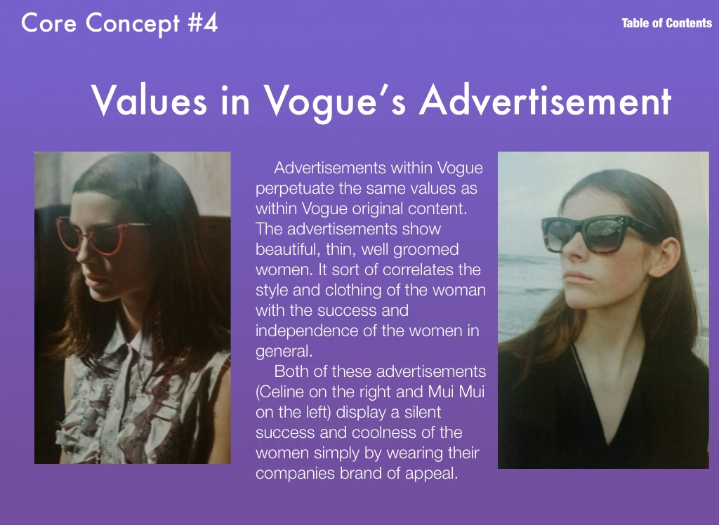 Advertisements within Vogue perpetuate the same values as within Vogue original content. The advertisements show beautiful, thin, well groomed women. It sort of correlates the style and clothing of the woman with the success and independence of the women in general.