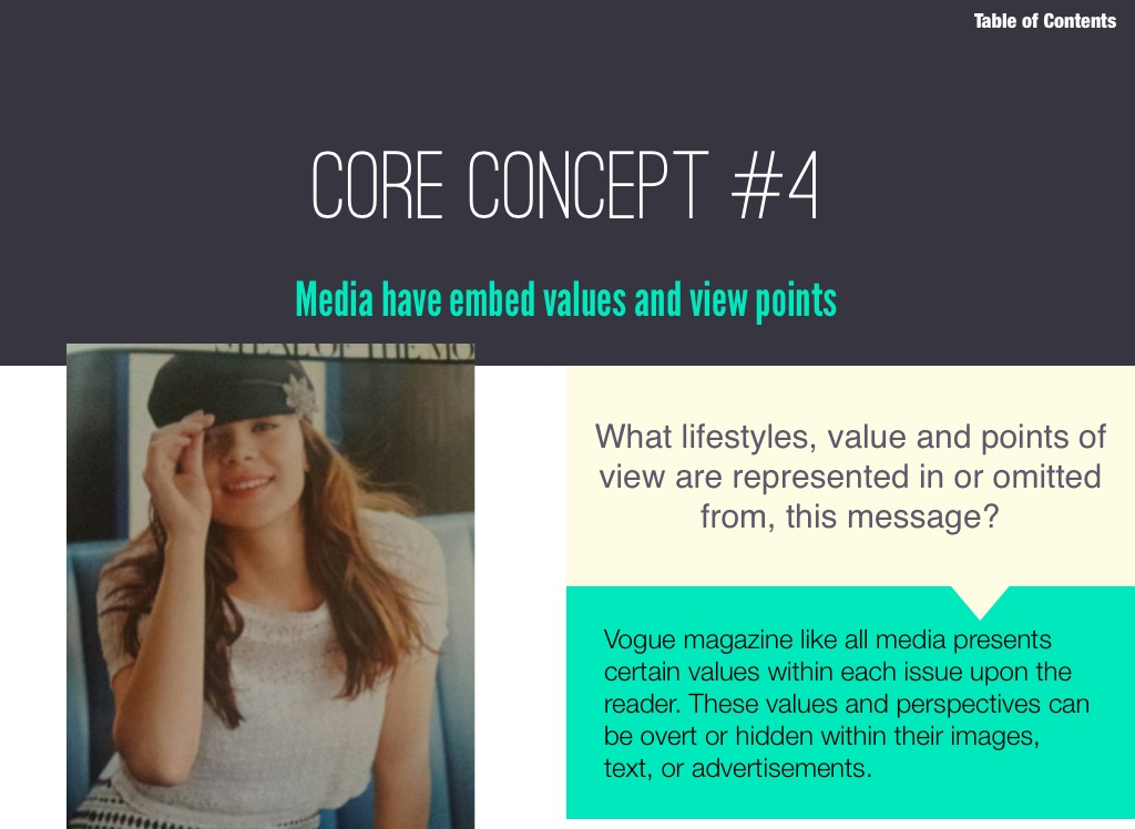Vogue magazine like all media presents certain values within each issue upon the reader. These values and perspectives can be overt or hidden within their images, text, or advertisements.