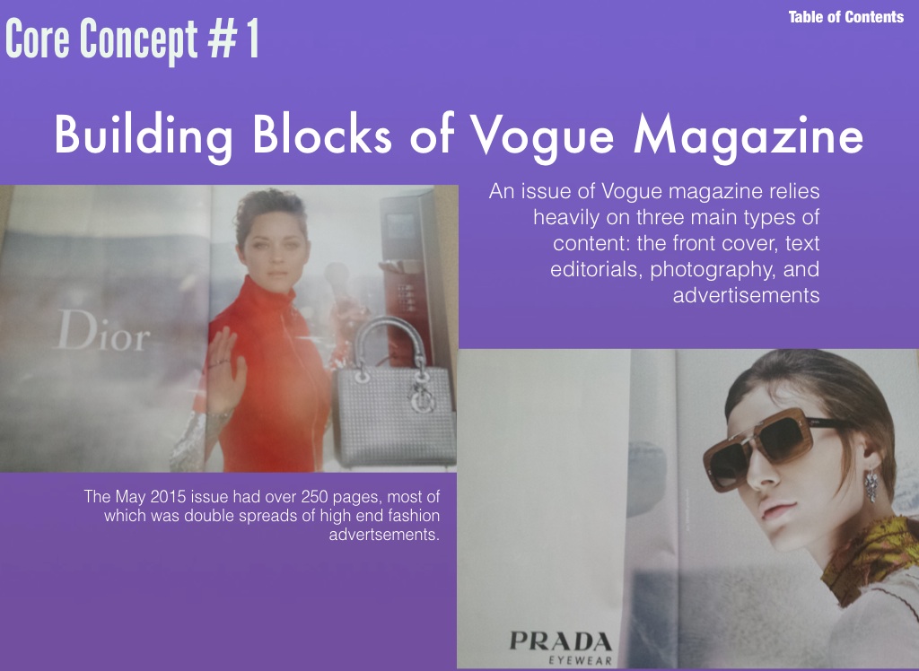 An issue of Vogue magazine relies heavily on three main types of content: the front cover, text editorials, photography, and advertisements