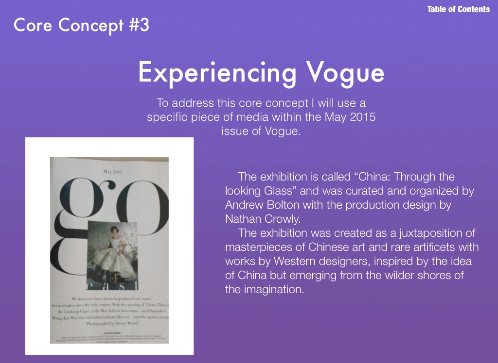 To address this core concept I will use a specific piece of media within the May 2015 issue of Vogue.