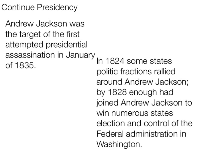 In 1824 some states politic fractions rallied around Andrew Jackson; by 1828 enough had joined Andrew Jackson to win numerous states election and control of the Federal administration in Washington.