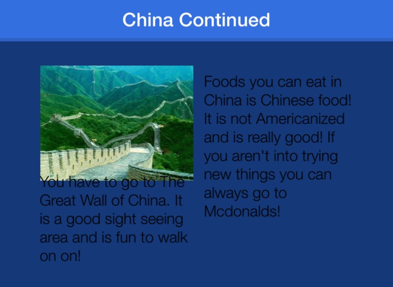 You have to go to The Great Wall of China. It is a good sight seeing area and is fun to walk on on!