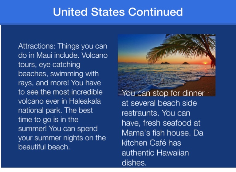 Attractions: Things you can do in Maui include. Volcano tours, eye catching beaches, swimming with rays, and more! You have to see the most incredible volcano ever in Haleakalā national park. The best time to go is in the summer! You can spend your summer nights on the beautiful beach.