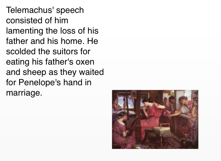 Telemachus' speech consisted of him lamenting the loss of his father and his home. He scolded the suitors for eating his father's oxen and sheep as they waited for Penelope's hand in marriage.