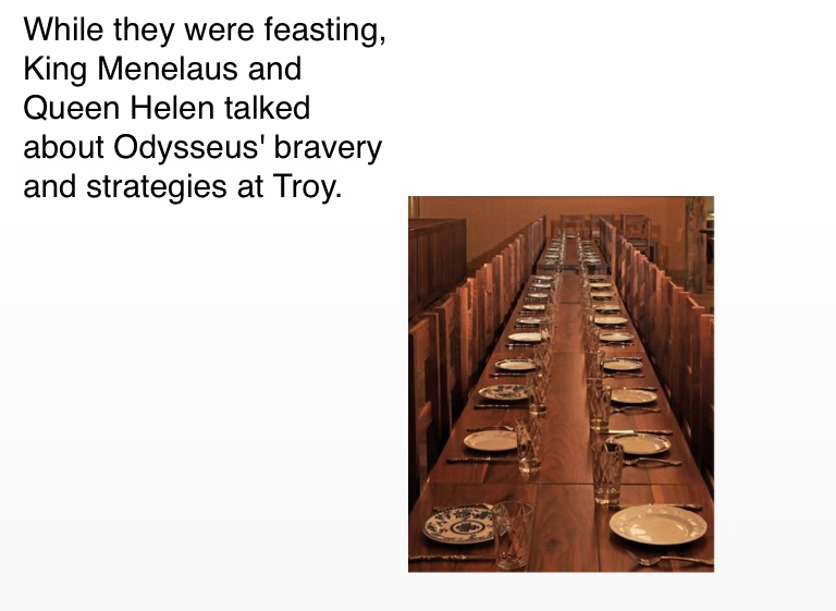 While they were feasting, King Menelaus and Queen Helen talked about Odysseus' bravery and strategies at Troy.