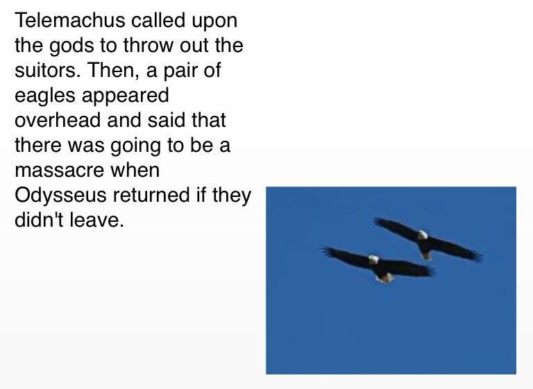 Telemachus called upon the gods to throw out the suitors. Then, a pair of eagles appeared overhead and said that there was going to be a massacre when Odysseus returned if they didn't leave.