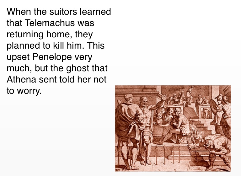 When the suitors learned that Telemachus was returning home, they planned to kill him. This upset Penelope very much, but the ghost that Athena sent told her not to worry.