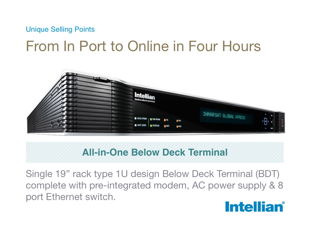 Single 19” rack type 1U design Below Deck Terminal (BDT) complete with pre-integrated modem, AC power supply & 8 port Ethernet switch.