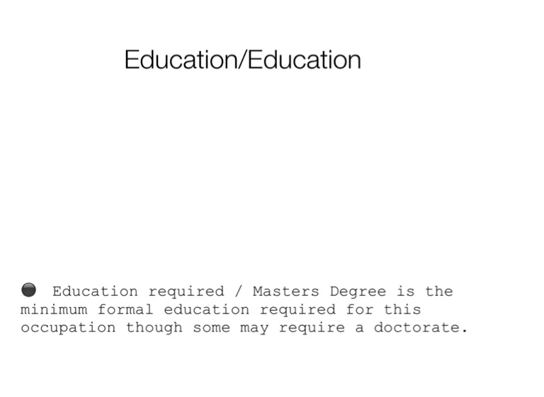 ⚫️ Education required / Masters Degree is the minimum formal education required for this occupation though some may require a doctorate.