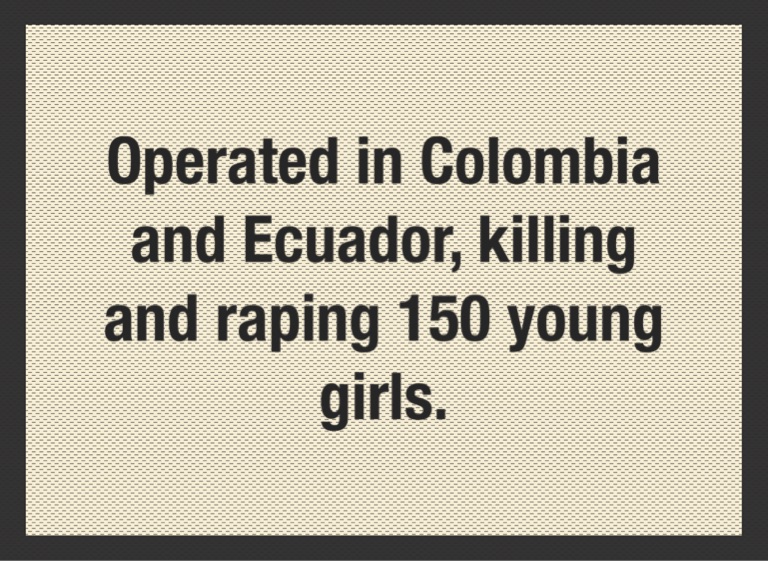 Operated in Colombia and Ecuador, killing and raping 150 young girls.