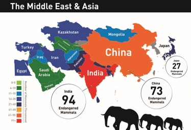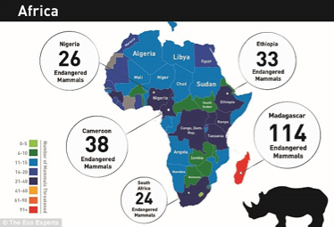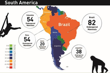 Most threatened birds, mammals and amphibians are located in Central and South America, Africa south of the Sahara, and tropical South and Southeast Asia