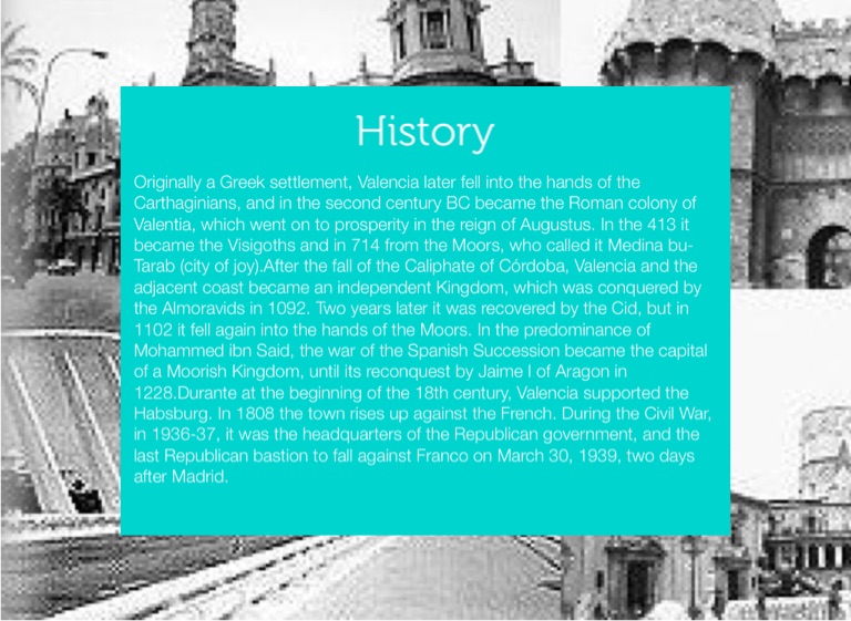 Originally a Greek settlement, Valencia later fell into the hands of the Carthaginians, and in the second century BC became the Roman colony of Valentia, which went on to prosperity in the reign of Augustus. In the 413 it became the Visigoths and in 714 from the Moors, who called it Medina bu-Tarab (city of joy).After the fall of the Caliphate of Córdoba, Valencia and the adjacent coast became an independent Kingdom, which was conquered by the Almoravids in 1092. Two years later it was recovered by the Cid, but in 1102 it fell again into the hands of the Moors. In the predominance of Mohammed ibn Said, the war of the Spanish Succession became the capital of a Moorish Kingdom, until its reconquest by Jaime I of Aragon in 1228.Durante at the beginning of the 18th century, Valencia supported the Habsburg. In 1808 the town rises up against the French. During the Civil War, in 1936-37, it was the headquarters of the Republican government, and the last Republican bastion to fall against Franco on March 30, 1939, two days after Madrid.