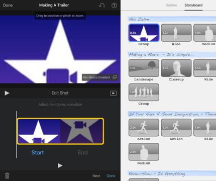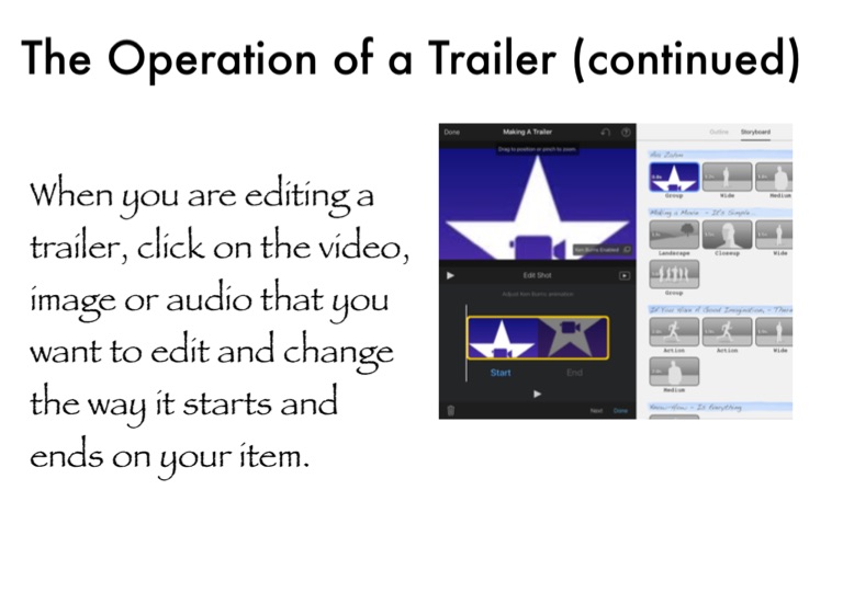 When you are editing a trailer, click on the video, image or audio that you want to edit and change the way it starts and ends on your item.