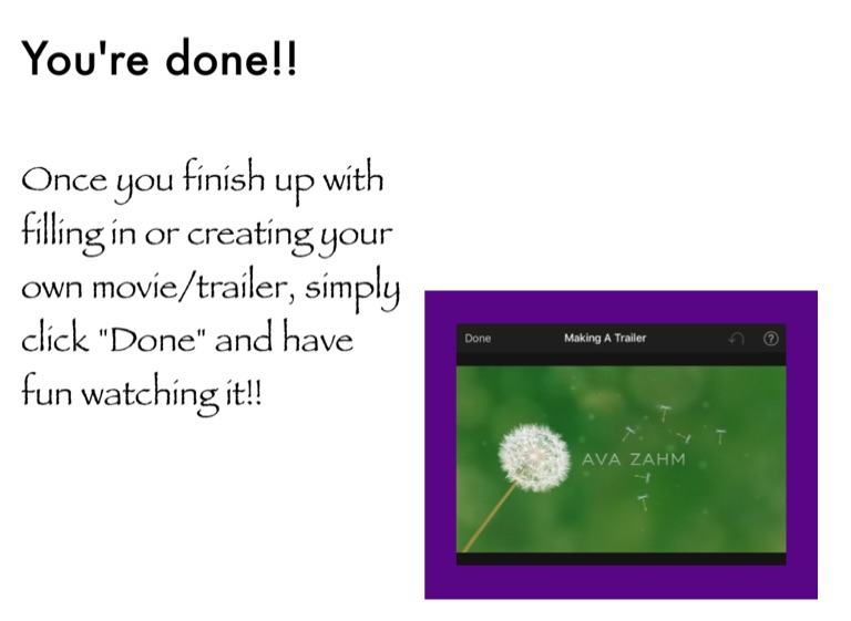 Once you finish up with filling in or creating your own movie/trailer, simply click "Done" and have fun watching it!!
