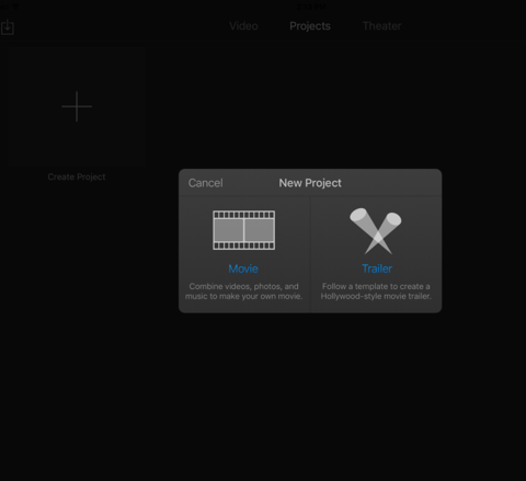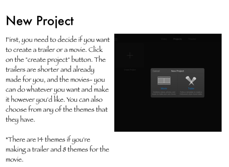 First, you need to decide if you want to create a trailer or a movie. Click on the "create project" button. The trailers are shorter and already made for you, and the movies- you can do whatever you want and make it however you'd like. You can also choose from any of the themes that they have.