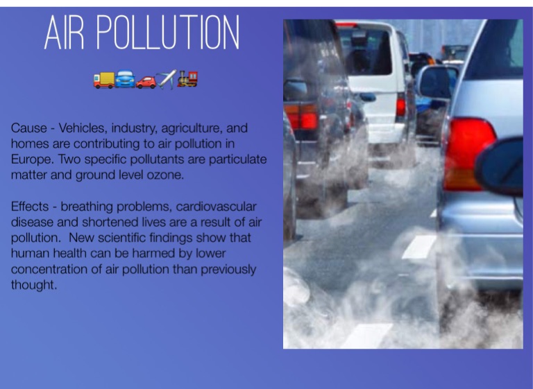 Cause - Vehicles, industry, agriculture, and homes are contributing to air pollution in Europe. Two specific pollutants are particulate matter and ground level ozone.