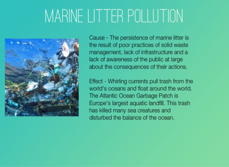 Effect - Whirling currents pull trash from the world's oceans and float around the world. The Atlantic Ocean Garbage Patch is Europe's largest aquatic landfill. This trash has killed many sea creatures and disturbed the balance of the ocean.