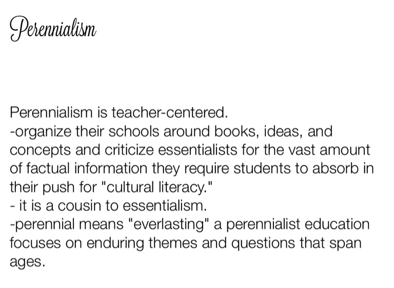 -perennial means "everlasting" a perennialist education focuses on enduring themes and questions that span ages.