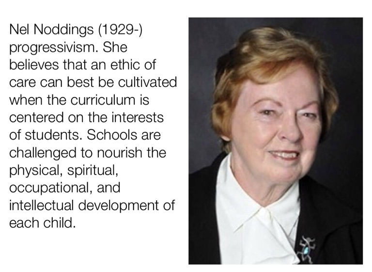 Nel Noddings (1929-) progressivism. She believes that an ethic of care can best be cultivated when the curriculum is centered on the interests of students. Schools are challenged to nourish the physical, spiritual, occupational, and intellectual development of each child.