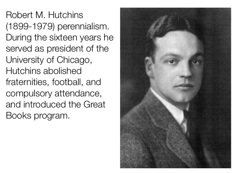 Robert M. Hutchins (1899-1979) perennialism. During the sixteen years he served as president of the University of Chicago, Hutchins abolished fraternities, football, and compulsory attendance, and introduced the Great Books program.