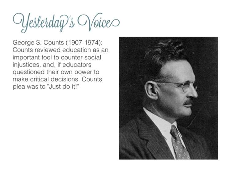 George S. Counts (1907-1974): Counts reviewed education as an important tool to counter social injustices, and, if educators questioned their own power to make critical decisions. Counts plea was to "Just do it!"