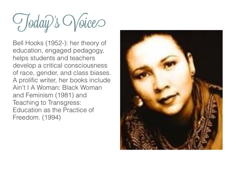 Bell Hooks (1952-): her theory of education, engaged pedagogy, helps students and teachers develop a critical consciousness of race, gender, and class biases. A prolific writer, her books include Ain't I A Woman: Black Woman and Feminism (1981) and Teaching to Transgress: Education as the Practice of Freedom. (1994)