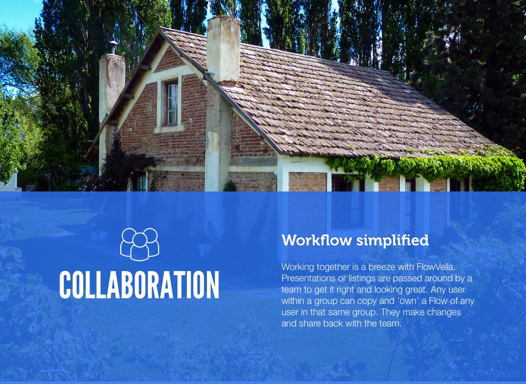 Working together is a breeze with FlowVella. Presentations or listings are passed around by a team to get it right and looking great. Any user within a group can copy and 'own' a Flow of any user in that same group. They make changes and share back with the team.