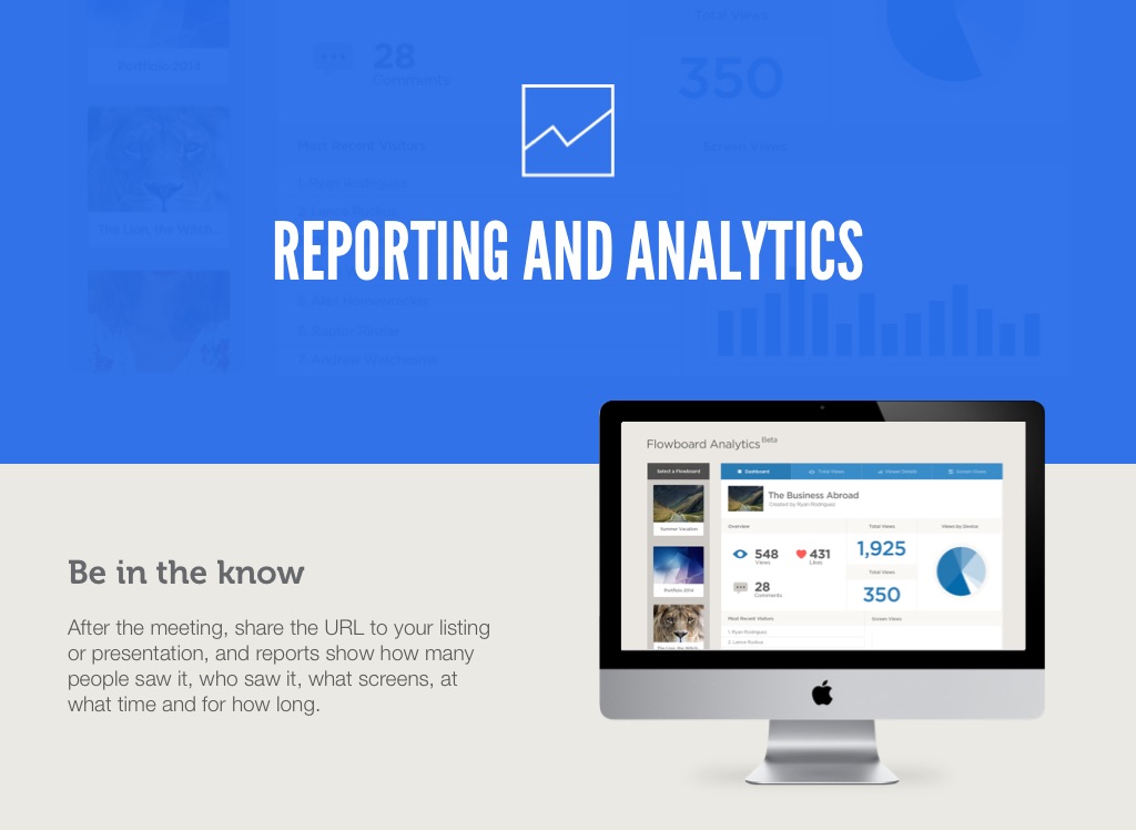 After the meeting, share the URL to your listing or presentation, and reports show how many people saw it, who saw it, what screens, at what time and for how long.