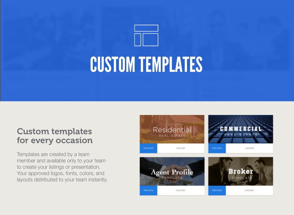 Templates are created by a team member and available only to your team to create your listings or presentation. Your approved logos, fonts, colors, and layouts distributed to your team instantly.