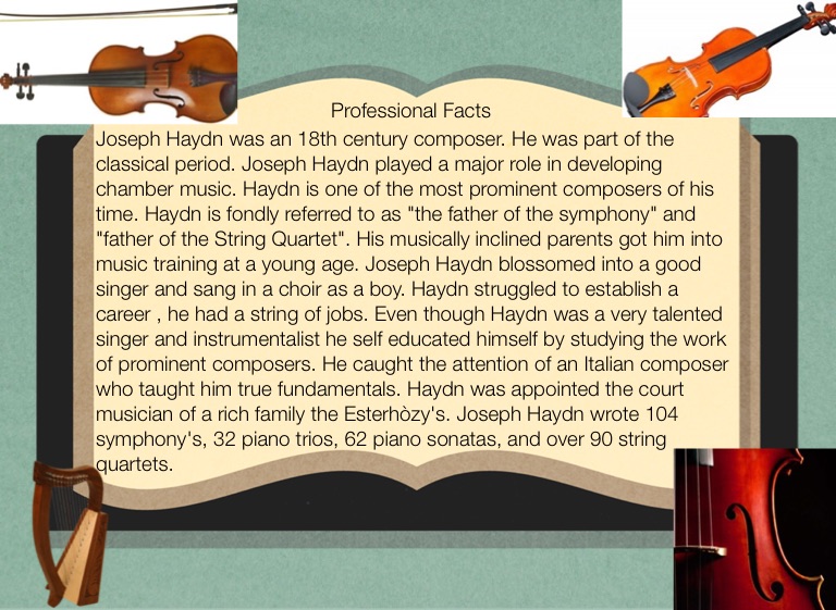Joseph Haydn was an 18th century composer. He was part of the classical period. Joseph Haydn played a major role in developing chamber music. Haydn is one of the most prominent composers of his time. Haydn is fondly referred to as "the father of the symphony" and "father of the String Quartet". His musically inclined parents got him into music training at a young age. Joseph Haydn blossomed into a good singer and sang in a choir as a boy. Haydn struggled to establish a career , he had a string of jobs. Even though Haydn was a very talented singer and instrumentalist he self educated himself by studying the work of prominent composers. He caught the attention of an Italian composer who taught him true fundamentals. Haydn was appointed the court musician of a rich family the Esterhòzy's. Joseph Haydn wrote 104 symphony's, 32 piano trios, 62 piano sonatas, and over 90 string quartets.
