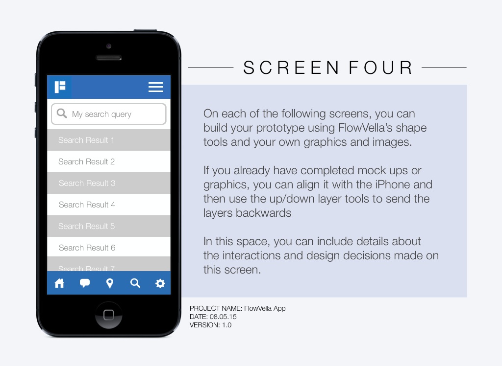 On each of the following screens, you can build your prototype using FlowVella’s shape tools and your own graphics and images.
