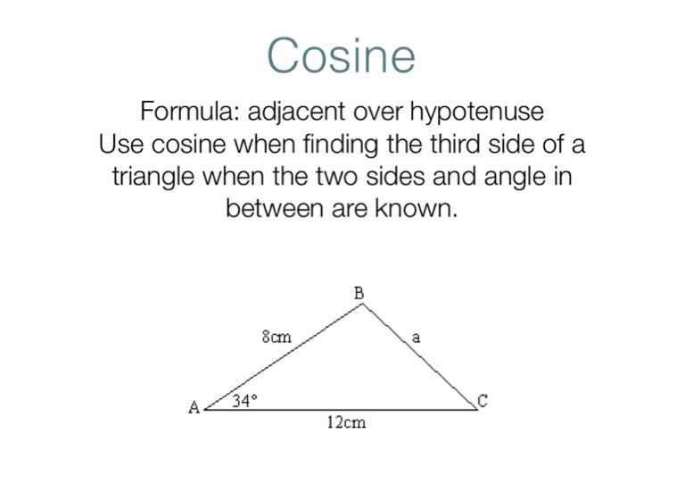 Use cosine when finding the third side of a triangle when the two sides and angle in between are known.
