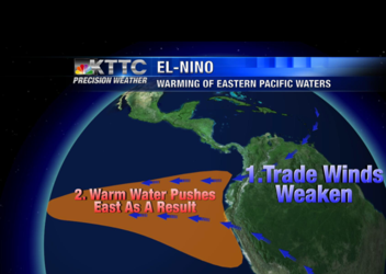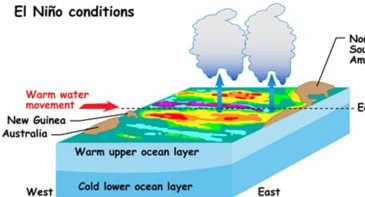 El Niño is the phenomenon when the trade winds slacken, forcing warm Pacific waters to move east, not west, causing extreme weather.