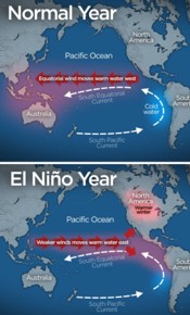 A visual showing the difference between a normal and El Niño year.