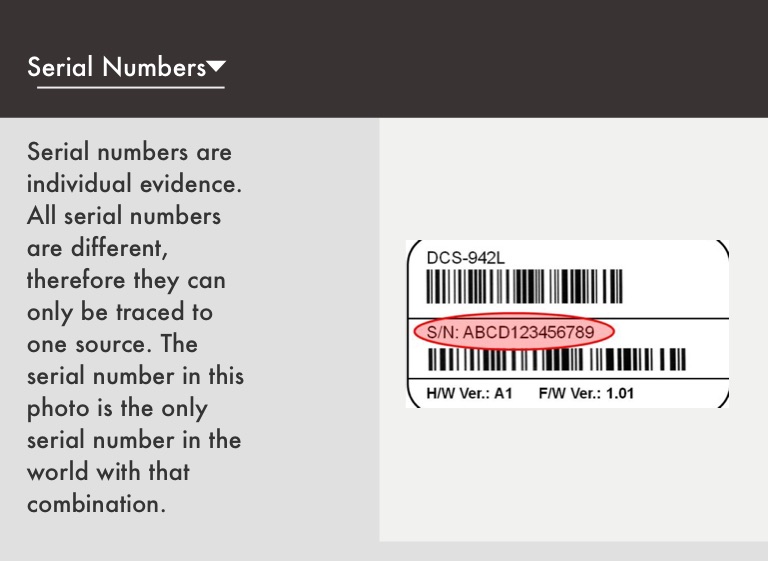 Serial numbers are individual evidence. All serial numbers are different, therefore they can only be traced to one source. The serial number in this photo is the only serial number in the world with that combination.