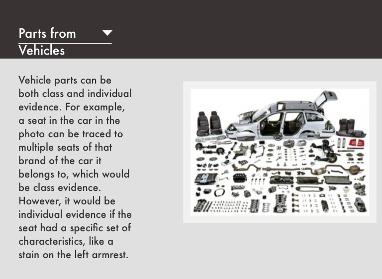 Vehicle parts can be both class and individual evidence. For example, a seat in the car in the photo can be traced to multiple seats of that brand of the car it belongs to, which would be class evidence. However, it would be individual evidence if the seat had a specific set of characteristics, like a stain on the left armrest.