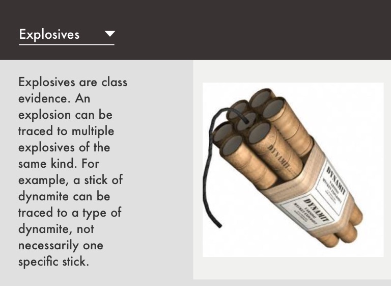 Explosives are class evidence. An explosion can be traced to multiple explosives of the same kind. For example, a stick of dynamite can be traced to a type of dynamite, not necessarily one specific stick.