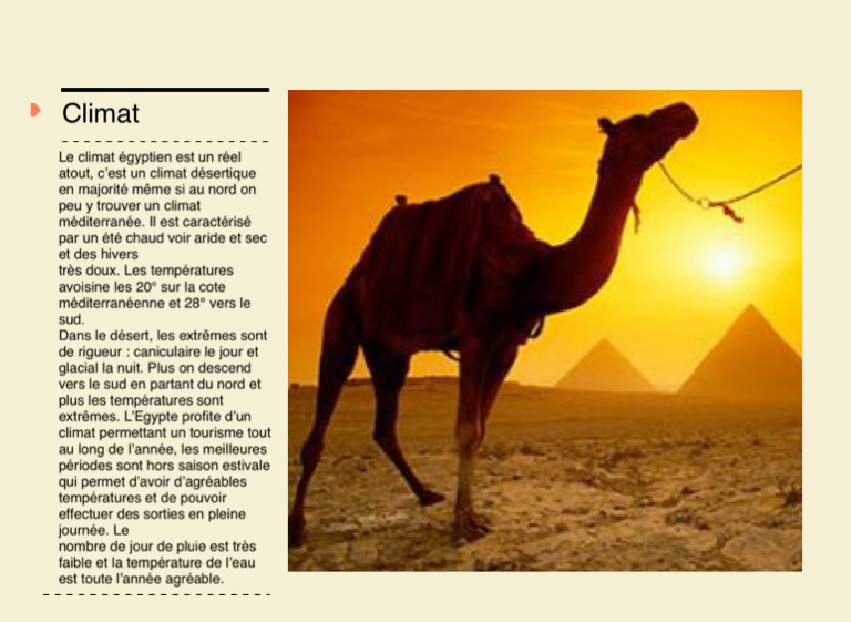 Le climat égyptien est un réel atout, c’est un climat désertique en majorité même si au nord on peu y trouver un climat méditerranée. Il est caractérisé par un été chaud voir aride et sec et des hivers