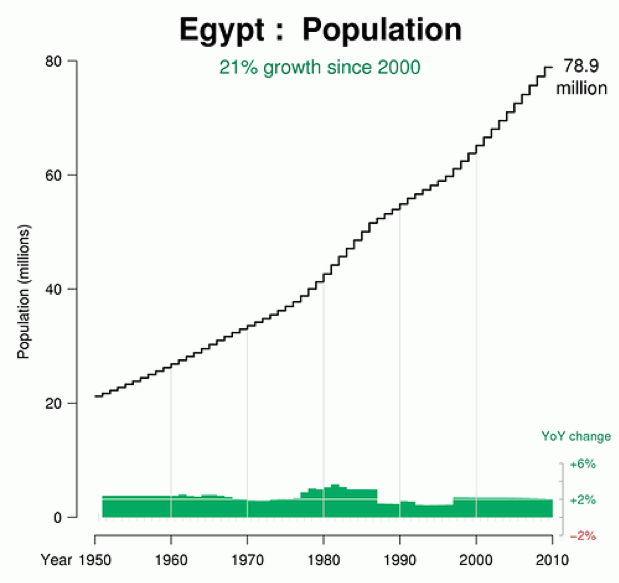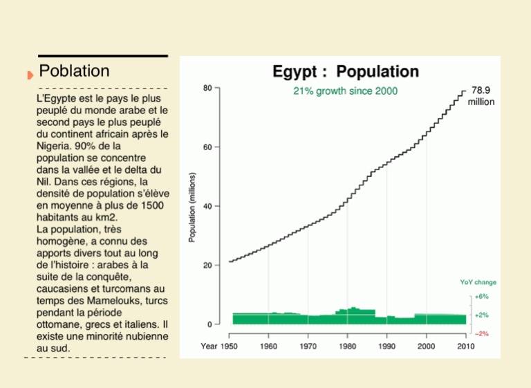 L’Egypte est le pays le plus peuplé du monde arabe et le second pays le plus peuplé du continent africain après le Nigeria. 90% de la population se concentre dans la vallée et le delta du Nil. Dans ces régions, la densité de population s’élève en moyenne à plus de 1500 habitants au km2.