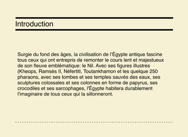 Surgie du fond des âges, la civilisation de l’Égypte antique fascine tous ceux qui ont entrepris de remonter le cours lent et majestueux de son fleuve emblématique: le Nil. Avec ses figures illustres (Kheops, Ramsès II, Néfertiti, Toutankhamon et les quelque 250 pharaons, avec ses tombes et ses temples sauvés des eaux, ses sculptures colossales et ses colonnes en forme de papyrus, ses crocodiles et ses sarcophages, l'Égypte habitera durablement l’imaginaire de tous ceux qui la sillonneront.