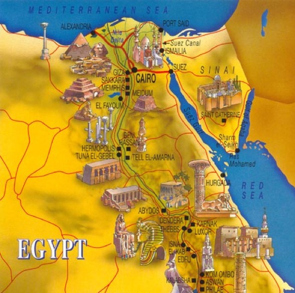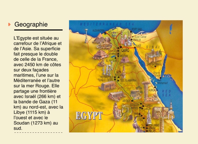 L’Egypte est située au carrefour de l’Afrique et de l’Asie. Sa superficie fait presque le double de celle de la France, avec 2450 km de côtes sur deux façades maritimes, l’une sur la Méditerranée et l’autre sur la mer Rouge. Elle partage une frontière avec Israël (266 km) et la bande de Gaza (11 km) au nord-est, avec la Libye (1115 km) à l’ouest et avec le Soudan (1273 km) au sud.