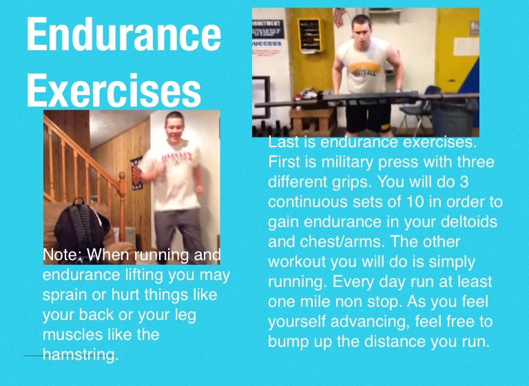 Last is endurance exercises. First is military press with three different grips. You will do 3 continuous sets of 10 in order to gain endurance in your deltoids and chest/arms. The other workout you will do is simply running. Every day run at least one mile non stop. As you feel yourself advancing, feel free to bump up the distance you run.