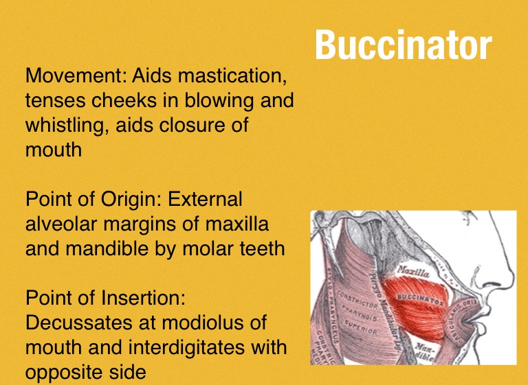 Movement: Aids mastication, tenses cheeks in blowing and whistling, aids closure of mouth